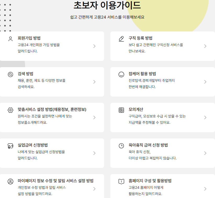 - 일자리 검색, 구직신청, 실업급여 신청, 출산휴가급여 신청, 국민내일배움카드 신청을 할 수 있습니다.
