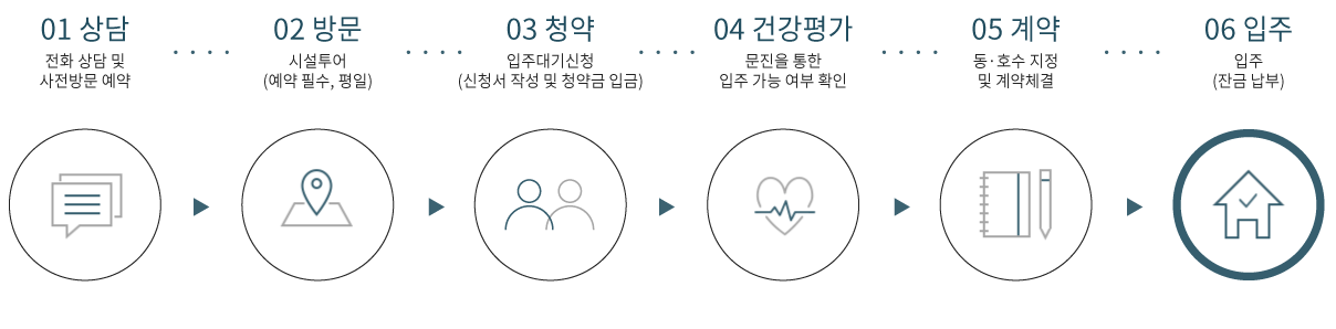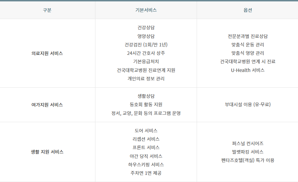 - 질병이 발생하기 전에 건강 상태를 미리 점검하여 예방하고, 발생된 질병은 조기에 발견해 간단한 치료로 건강을 유지하도록 특화된 최적의 프리미엄 급 건강검진 프로그램 서비스 제공(입주 시 연 1회 건강검진 제공)