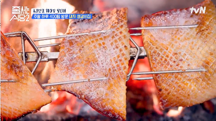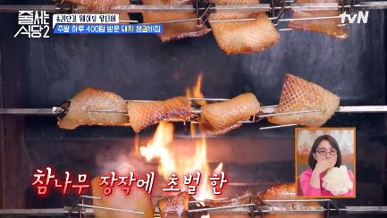 참나무 장작에서 1차, 불판에서 2차 구운 장작 돼지 껍데기